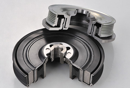 曲軸減震皮帶輪,是發(fā)動機前端附件系統(tǒng)的重要零件之一,分為橡膠減震皮帶輪、硅油扭轉(zhuǎn)減震皮帶輪及橡膠硅油復合型扭轉(zhuǎn)減震皮帶輪,基本結(jié)構(gòu)一般由輪轂、外圈、橡膠組成,大多安裝于曲軸的前端,傳遞曲軸輸出的扭矩以驅(qū)動輪系附件。